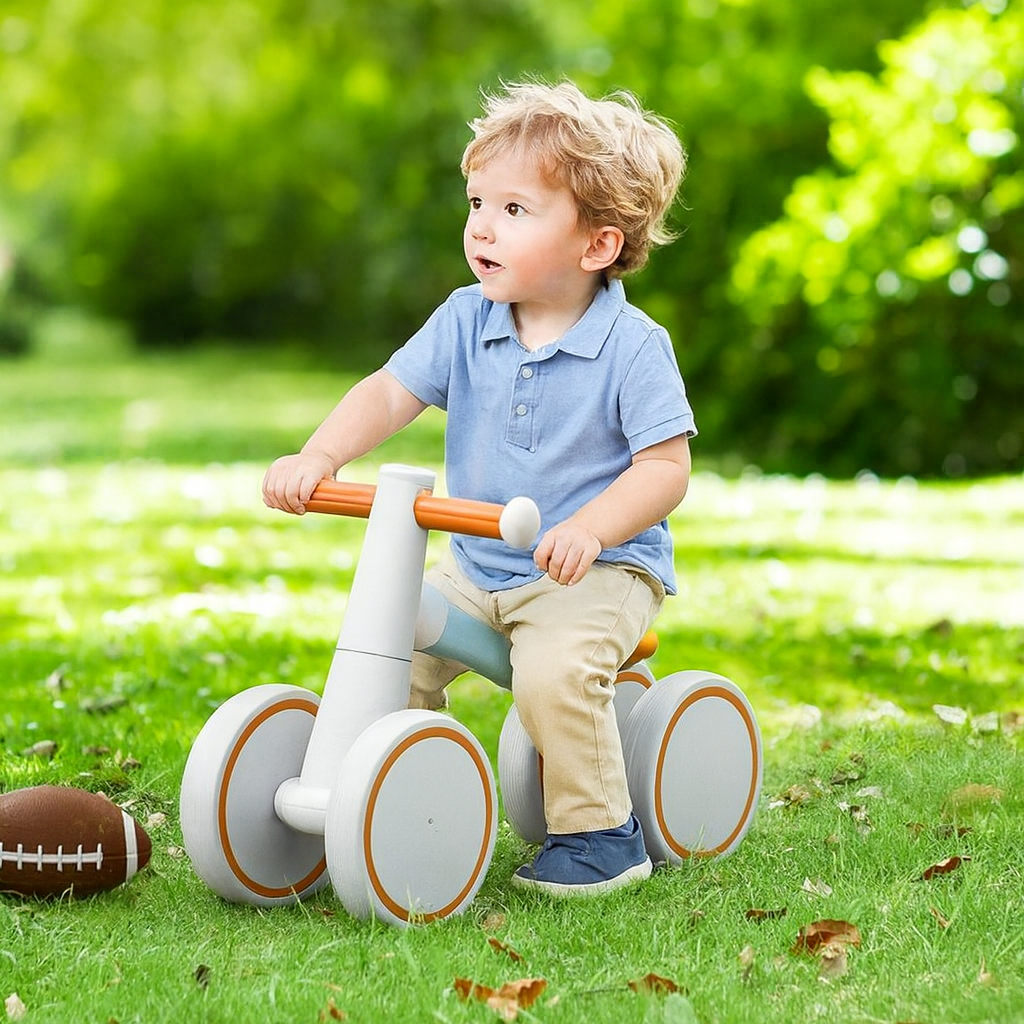 Your child wants to ride it right in your living room? That’s cool — the bike’s wheels are smooth and silent. A ride in the park? The 4 wheels are aligned to make sure it’s super stable, and there’s no fear of tipping over.
